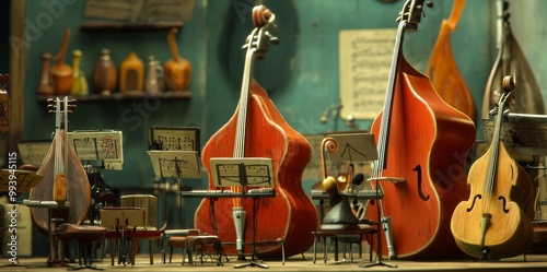 Naklejka premium A charming miniature orchestra setup with tiny instruments and music sheets,...