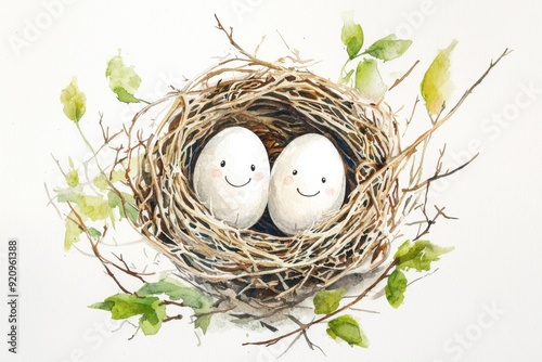 Obraz premium A charming nest with two decorated eggs, surrounded by greenery, symbolizing...