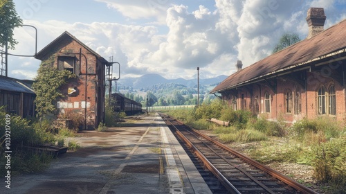 Fototapeta premium A charming, old countryside train station with weathered brick buildings, overgrown platforms, and a rusting railway track, surrounded by quiet fields and distant mountains.