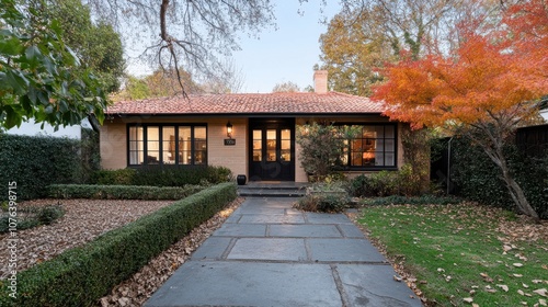Fototapeta premium A charming orange cottage with vibrant autumn foliage, bordered by manicured hedges and a neat stone path leading to a welcoming entrance.