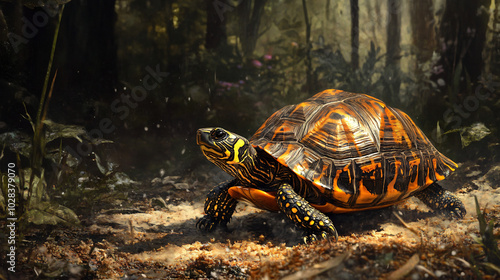 © GoldPumaze, Obraz premium A charming ornate box turtle exploring the forest floor