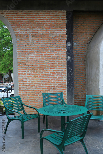 © zilvergolf, Fototapeta premium A charming outdoor seating area featuring vibrant green metal chairs and a matching round table, set against a rustic exposed brick wall.