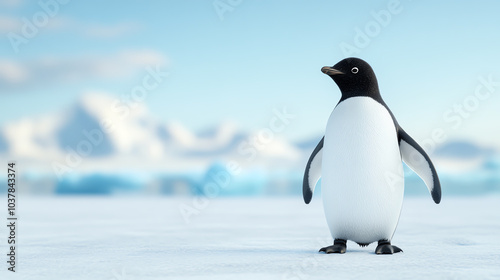 © Marketplace, Naklejka premium A charming penguin standing on icy terrain, showcasing its black and white feathers against a serene blue backdrop of the Arctic landscape.