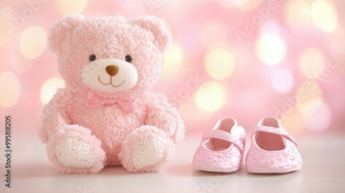 Obraz premium A charming pink teddy bear is placed next to sweet baby shoes on a lovely pink backdrop, ideal for celebrating a new arrival