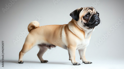 © missisya, Obraz premium A charming pug standing gracefully, showcasing its distinctive features and playful personality against a soft background.