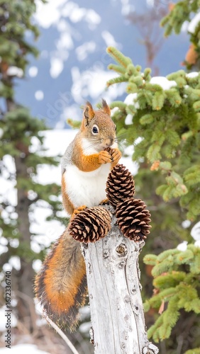 © Fatih, Fototapeta premium A charming red squirrel, perched atop a weathered log, enjoys a pair of pine cones in a snowy mountain setting.
