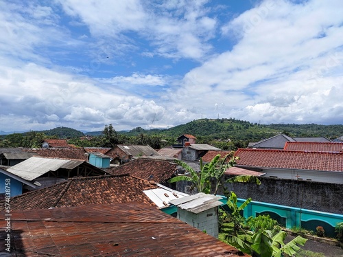 © Mart123, Obraz premium A charming residential district with colorful roofs and buildings against a backdrop of fluffy clouds, creating an idyllic scene.