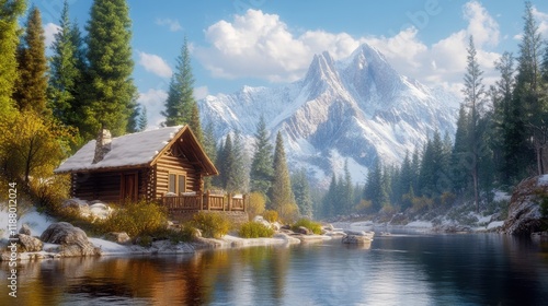 © รุ่งอรุณ ศรีนรสิทธิ์, Fototapeta premium A charming, rustic cabin by a quiet river, surrounded by snow-capped mountains and evergreen trees, creating a serene winter scene.