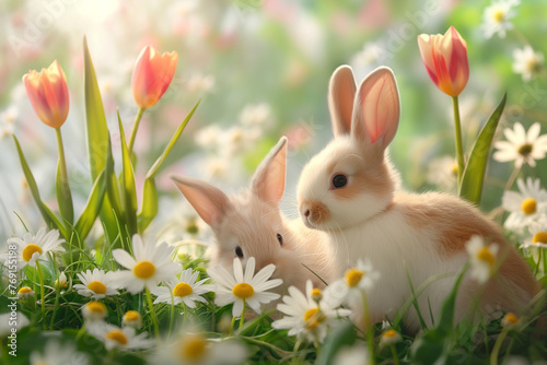 Fototapeta premium A charming scene of fluffy Easter bunnies