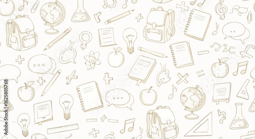 © Miftakhul, Fototapeta premium A charming seamless pattern featuring various hand-drawn school doodles and essential educational supplies like backpacks, globes, apples, books, and pencils on a clean white background