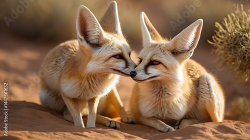 Obraz premium A charming shot of a fennec fox couple in the desert, showcasing their large...