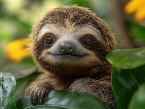 © Antonov, Fototapeta premium A charming sloth relaxing on a tree, captured in a stunning close-up. This adorable creature embodies tranquility and the slow pace of the rainforest.