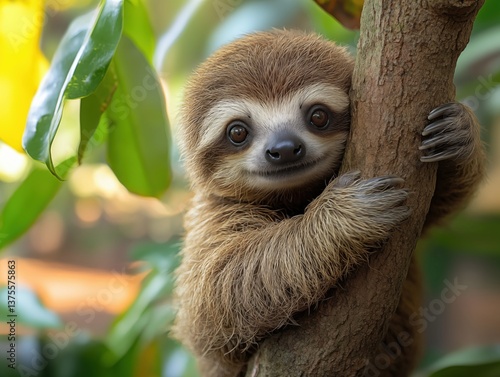 © Antonov, Fototapeta premium A charming sloth relaxing on a tree, captured in a stunning close-up. This adorable creature embodies tranquility and the slow pace of the rainforest.