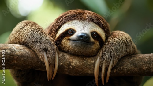 © Hungarian, Naklejka premium A charming sloth resting peacefully on a tree branch.