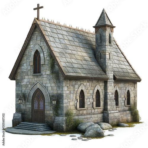 © imagemir, Fototapeta premium A charming stone church with a cross atop its turret, surrounded by earthy tones and natural elements.