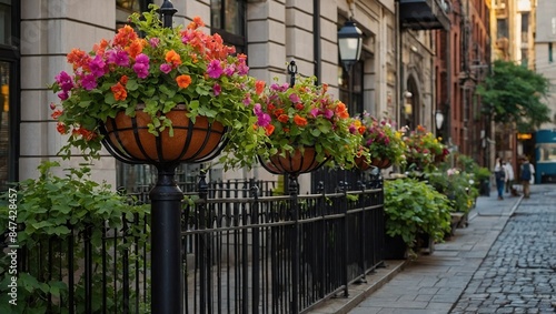 © Arman, Fototapeta premium A charming street scene with colorful flower pots adorning the side of a building