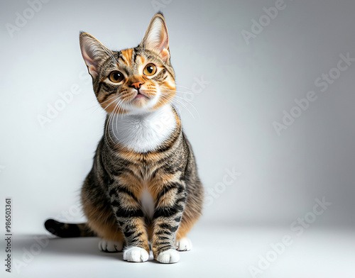 © missisya, Obraz premium A charming tabby cat with expressive eyes and a curious pose against a soft background, perfect for pet lovers.