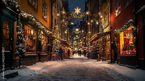 Fototapeta premium A charming view of Gamla Stan, Stockholm, during Christmas, the narrow streets illuminated with soft golden lights, the historic buildings adorned with red and green holiday decorations.