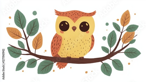 Obraz premium A charming watercolor illustration of an owl perched on a branch surrounded...