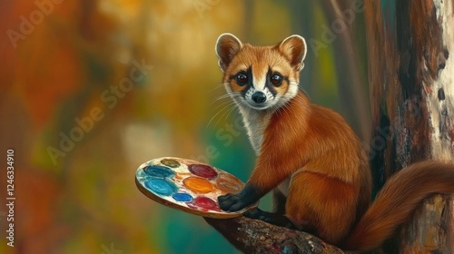 Fototapeta premium A charming weasel artist paints a colorful palette in a sun-drenched forest...