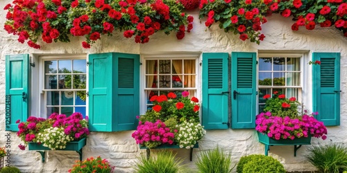 Naklejka premium A charming white cottage, accented by teal shutters, bursts with red and white impatiens.