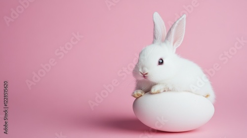 © ddaremmth, Obraz premium A charming white Easter bunny, creatively crafted from an egg, rests on a lovely pink background, enhancing the festive atmosphere