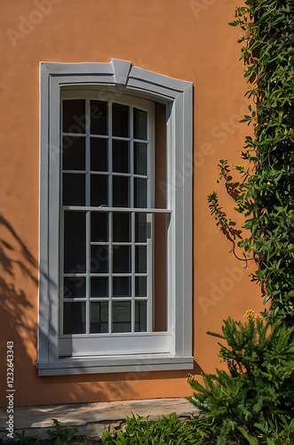 Fototapeta premium A charming window with a grey frame and multiple panes, set against an orange stucco wall, surrounded by greenery. The scene is bathed in sunlight, creating beautiful shadows.