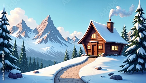 Naklejka premium A Charming Winter Cottage Nestled in a Beautiful Snowy Mountain Landscape Setting