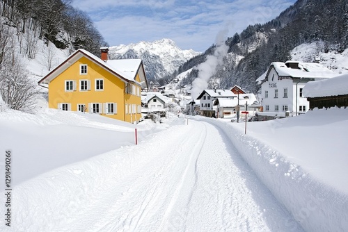 © Thanyarat, Naklejka premium A charming winter village covered in snow, with smoke rising from chimney tops