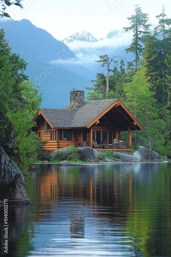 Naklejka premium A charming wooden cabin sits peacefully by the lake, surrounded by lush...