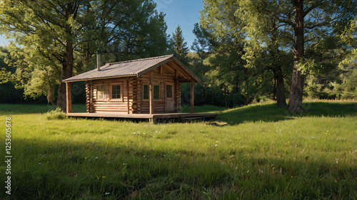 © Ben, Fototapeta premium A charming wooden log cabin with a metal roof and a small porch nestles in a sun dappled grassy field, surrounded by tall trees.