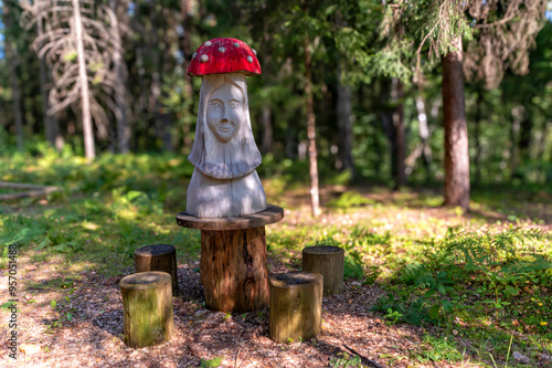 Fototapeta premium A charming wooden sculpture sits surrounded by nature in a peaceful forest...