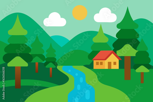 Fototapeta premium A charming yellow house with a red roof nestled in a lush green forest beside a winding blue river under a sunny sky with clouds