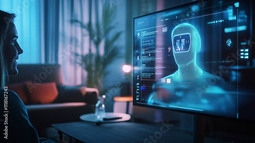 Naklejka premium A chatbot window projected in augmented reality, with a virtual assistant seamlessly integrated into the user's high-tech home environment