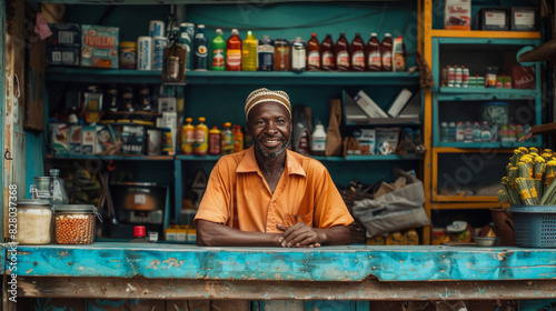 Naklejka premium A cheerful African man standing proudly in his colorful small shop filled...