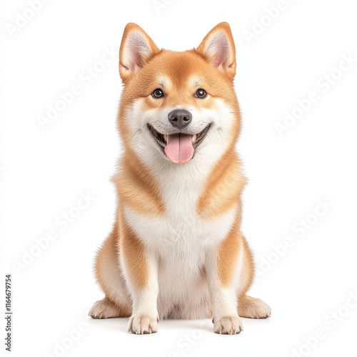 © UnderTheSun, Fototapeta premium A cheerful Akita dog sits calmly, showcasing its friendly demeanor and vibrant fur.