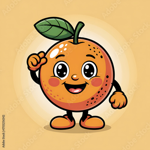 © Watchak, Fototapeta premium A cheerful and sparkling cartoon orange with a leaf on its head.