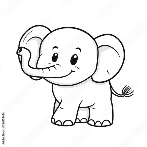 © Priyanut, Naklejka premium A cheerful baby elephant, playfully lifting its trunk, smiles brightly against a stark white background. Its cartoonish features exude joy and innocence.