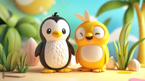 Fototapeta premium A cheerful black penguin and yellow bird standing together peacefully