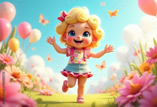 © Vibudhaart, Fototapeta premium A cheerful blonde girl joyfully runs through a vibrant flower field, surrounded by butterflies and balloons.