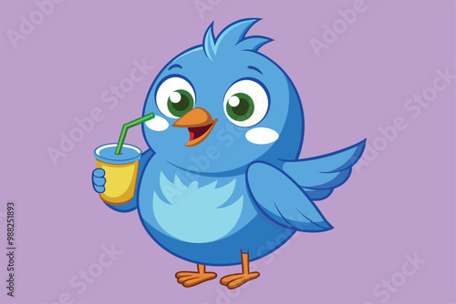 Fototapeta premium A cheerful blue cartoon bird happily holds a colorful drink with a straw,...