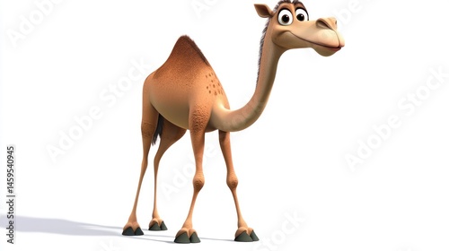 © azi, Naklejka premium A cheerful, cartoon camel stands against a white background, its long neck and single hump visible