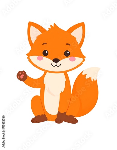 © garieng, Obraz premium A cheerful, cartoon fox character with bright orange fur and a friendly expression sits and waves.