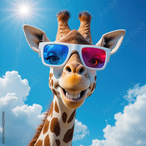 © Budi, Fototapeta premium A cheerful cartoon giraffe wearing 3D glasses smiles under a sunny sky, blending humor, whimsy, and vibrant animated charm.