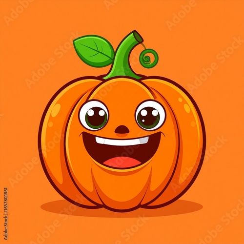 Fototapeta premium A cheerful, cartoon pumpkin with large eyes and a wide smile stands out against a vibrant orange background.