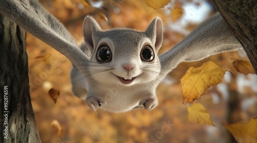 © BerkahStock, Obraz premium A cheerful cartoon squirrel with large eyes, surrounded by autumn leaves.