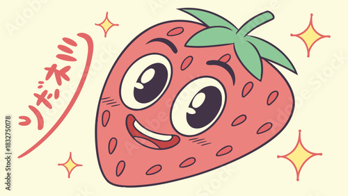© Nur, Obraz premium A cheerful cartoon strawberry with a happy face and sparkling elements, featuring Japanese text.