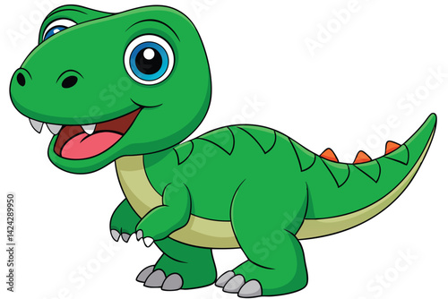 © Abu hamed shah, Naklejka premium A cheerful cartoon tyrannosaurus with green scales and bright eyes stands smiling on a white background, Tyrannosaurus cartoon on white background.