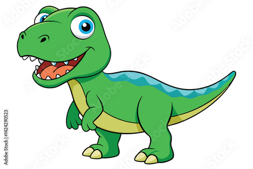 © Abu hamed shah, Naklejka premium A cheerful cartoon tyrannosaurus with green scales and bright eyes stands smiling on a white background, Tyrannosaurus cartoon on white background.