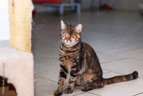 © Vera Aksionava, Fototapeta premium A cheerful cat with only one eye is smiling and gazing at the camera